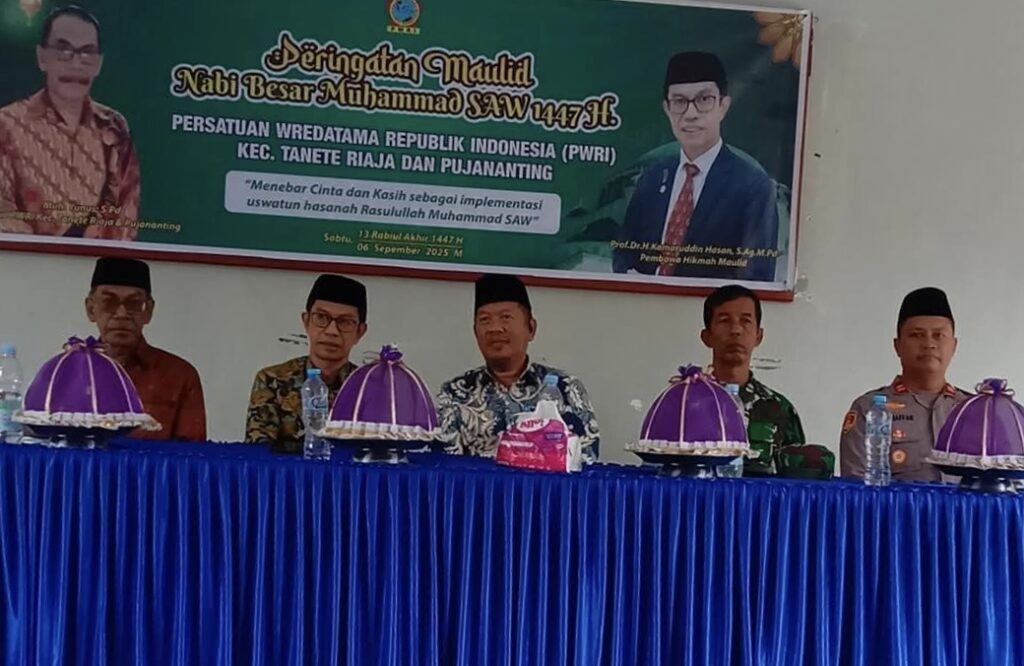 Persatuan Wredatama Republik Indonesia (PWRI) Kecamatan Tanete Riaja dan Pujananting Kabupaten Barru melaksanakan peringatan Maulid Nabi Besar Muhammad SAW di aula Kantor Camat Tanete Riaja, Sabtu, 6 September 2025